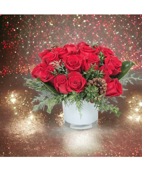 Everyone loves roses. These are done "Winter Style" in a low and lush cylinder vase.
