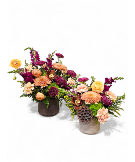 We’ll create a custom arrangement inspired by the photo shown, using our Bonfire Petal palette—a rich blend of golden amber, deep burgundy, plum, and rustic greens. Expect bold seasonal textures and warm, moody tones that evoke the glow of autumn twilight. Each piece will be thoughtfully composed to echo the spirit of fall with a touch of dramatic elegance.