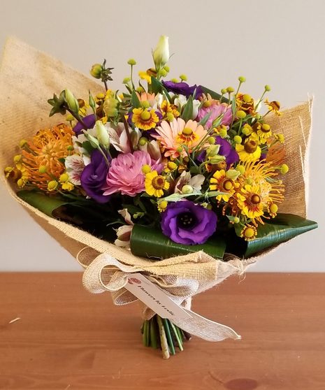A hand-tied ready to place into your own vase, no designing required. Designed in brights & fall colors with the freshest seasonal flowers of the day. Flower choices will vary.