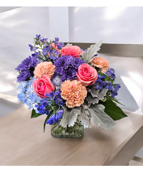 Perfect for birthdays, bold statements, or creative gift-giving—Candy Paint celebrates playful color and clean geometry. Its mix of glossy purple, coral, and blue hues pops against cool grey foliage, all grounded in a chic low cube.