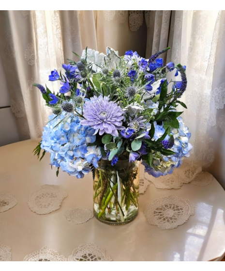 This all-blue floral design with its cottage feel will bring a sense of tranquility and natural elegance to any space it graces. Our designers will create a design custom just for you with our most beautiful blue blooms of the day.