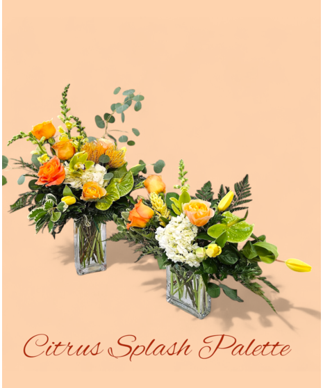 Citrus Splash Zesty and refreshing, this radiant design blends sunny yellow blooms, tangy orange blossoms, and crisp green accents into a bouquet that feels like a burst of sunshine. “Citrus Splash” is a celebration of vitality and warmth—perfect for lifting spirits and brightening any space. Whether it’s a cheerful get well gesture, a thank you, or a splash of joy for a summer celebration, this palette delivers pure positivity with every petal.