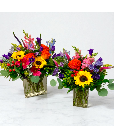 Razzle Dazzle A kaleidoscope of joy, this dazzling design bursts with bold personality and radiant charm. Featuring a lively mix of hot pink, purple, sunny yellow, fiery orange, and scarlet red, each bloom dances in harmony to create a show-stopping spectacle. Designed to uplift and energize, “Razzle Dazzle” is a celebration in floral form—perfect for those who love life in full color.