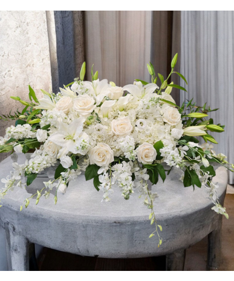 A heartfelt tribute from the Ivory and Pearl collection, this all-white casket cover is designed with graceful lines and soft textures that convey purity and reverence. Each bloom is thoughtfully chosen to create a serene, flowing composition that honors with quiet strength and timeless elegance. Its peaceful palette offers a gentle expression of love, remembrance, and enduring grace.