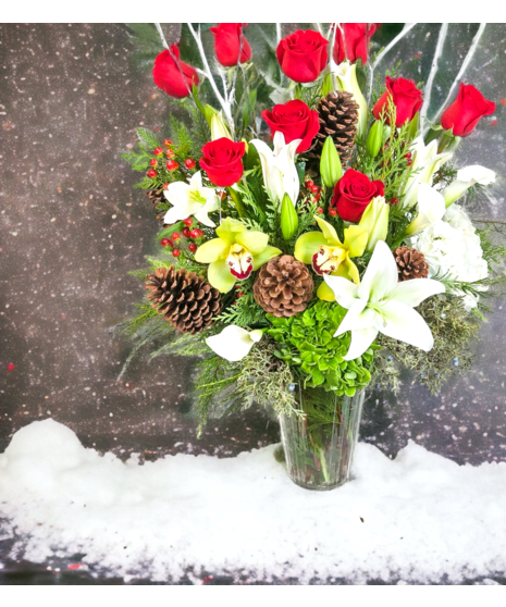 Full and tall, this lovely holiday vase will be the highlight of any home. Filled with hydrangea, roses, lilies, orchids and winter greens and cones.