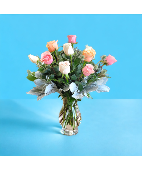 Long stem roses in a trio of pastel colors arranged in a vase with textural accent flowers. Our roses are farm direct and high quality with a long vase life.