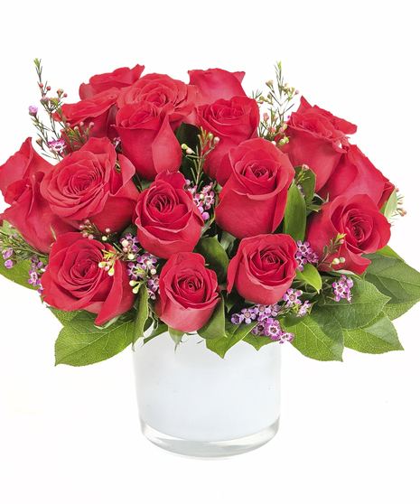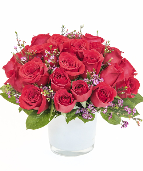 A modern take on a true classic. Red roses and accent flowers in a cylinder vase designed low and lush.