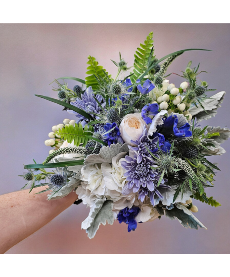This bridal bouquet features vibrant blues, highlighted by touches of silvery greenery and bursts of white.