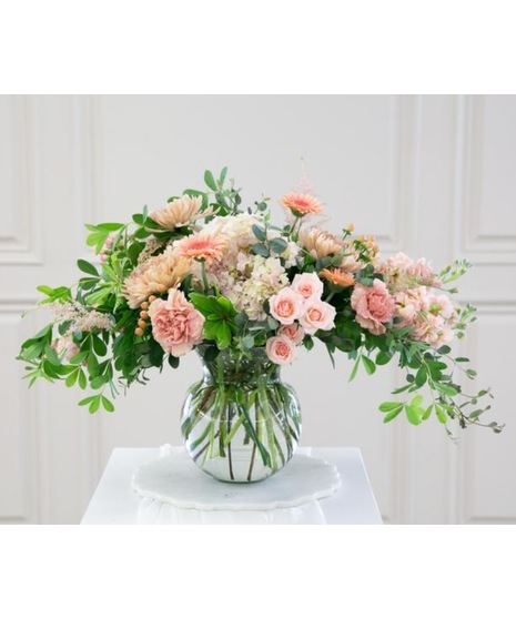 A pink vase arrangement with cascading greenery in a lovely peony vase.