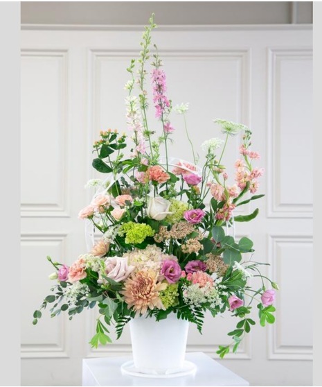 A classic sympathy piece in shades of pink with roses, carnations, lisianthus and hydrangea.