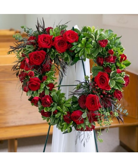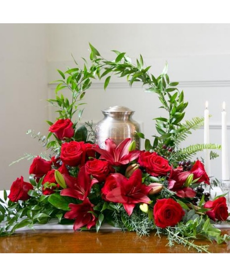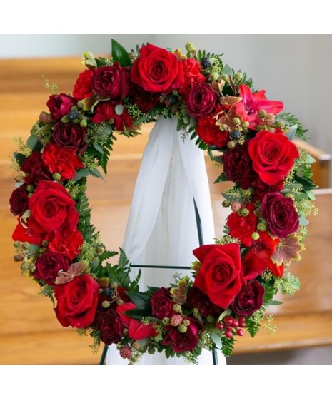Rich Reds A striking collection of sympathy arrangements in rich reds, crimson tones, and velvety burgundies — thoughtfully designed to honor lasting love and offer a sense of profound remembrance. Available in an array of styles, including urn surrounds, casket tributes, standing sprays, wreaths, and elegant vase designs.