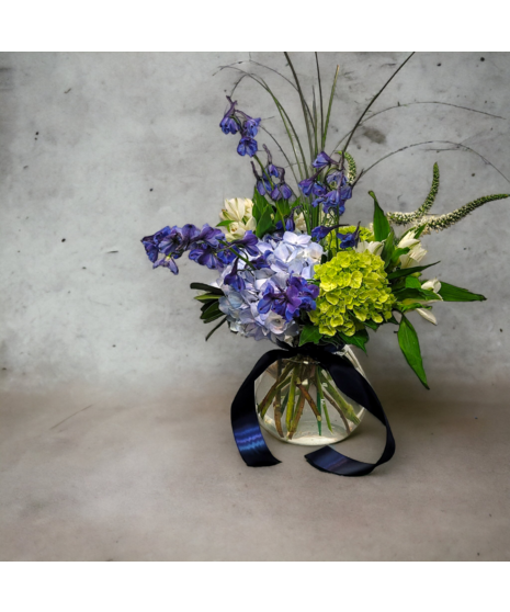 SEA GRASS — Coastal Elegance in Bloom Channeling crisp ocean breezes and seaside charm, Sea Grass features lush blue and green hydrangea, airy blue delphinium, and graceful white veronica. Tied with a deep navy satin ribbon, it’s a nod to nautical simplicity and New England serenity. Ideal for summer celebrations, housewarmings, or anyone dreaming of salt air and sandy toes.