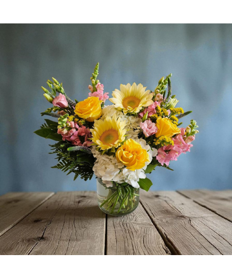 Summer Serenade A radiant medley of sun-kissed blooms, Summer Serenade sings with warmth and joy. Golden sunflowers, buttery roses, and playful snapdragons dance together in a cheerful harmony, evoking the carefree spirit of a summer afternoon. Accents of fresh greenery and seasonal textures complete the arrangement, creating a vibrant composition that feels like a heartfelt melody in floral form.