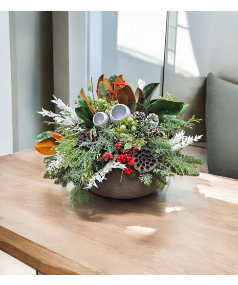 This charming holiday planter features an assortment of winter greens and berries with pods and cones, all nestled in a stone planter. With proper watering and care, it will last all season. It's a wonderful gift for yourself or a loved one, bringing a touch of natural beauty to any space.