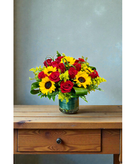 This charming design features sunflowers and red roses, perfectly capturing the sentiment "You are my sunshine." It's a delightful arrangement that brings warmth and joy to any space.