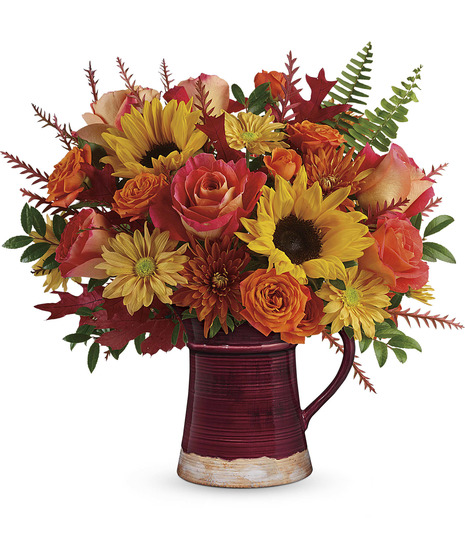 This bright of seasonal sunflowers and roses is a joyful celebration of fall's bounty! Arranged in a stunning hand-glazed ceramic pitcher, it's a gift they'll enjoy for many autumns to come.